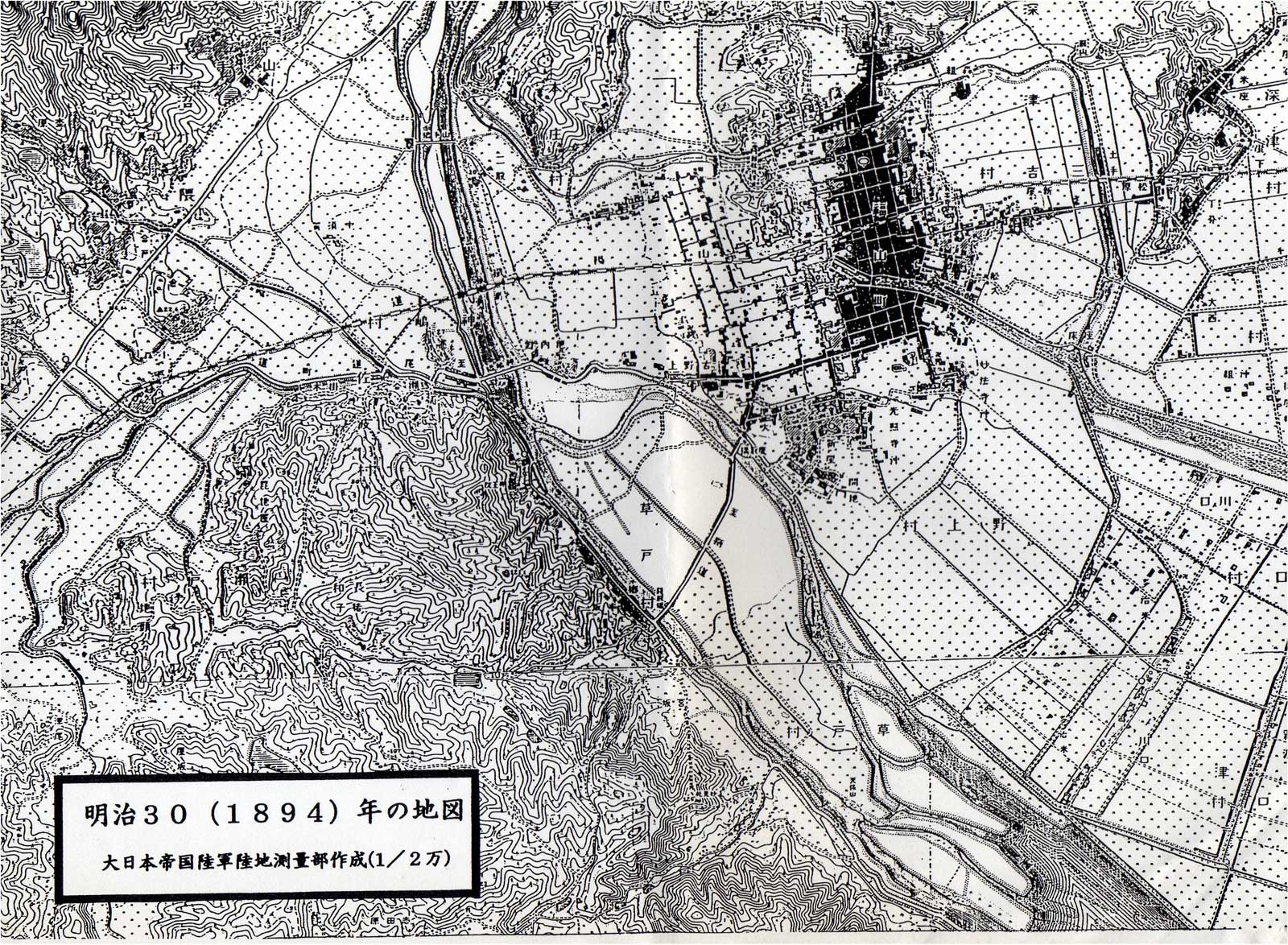 城から築切、天下橋、木綿橋を望む(手前は二重櫓)