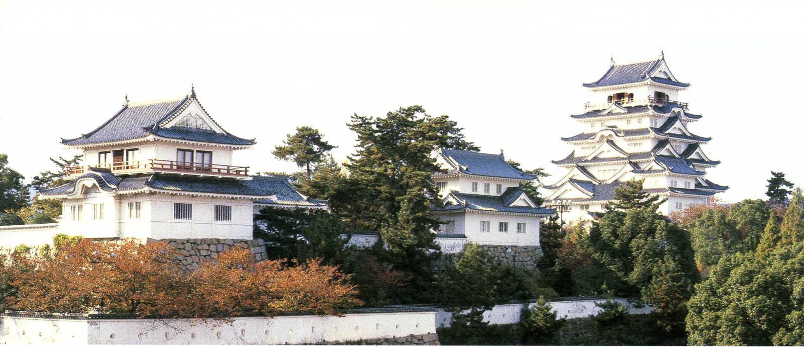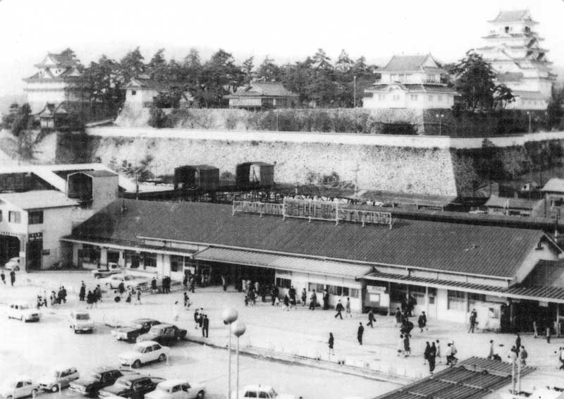 昭和49年 きたはま通りから見る福山城 手前にケーキの「白ばら」ビル